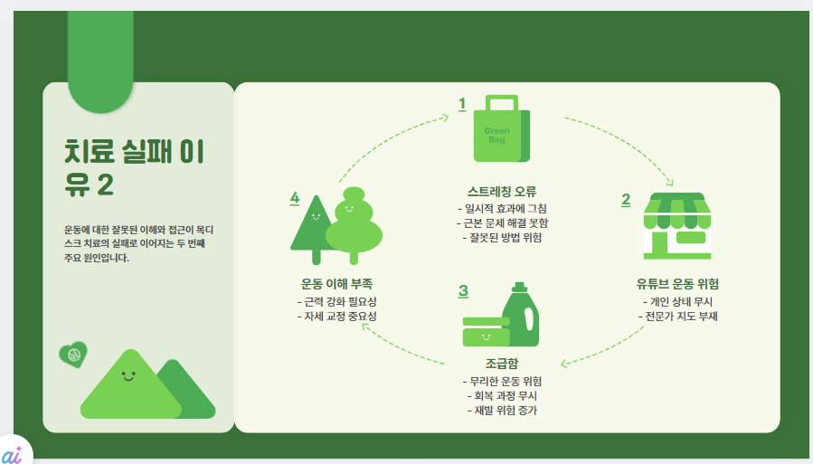 치료 계획은 있지만 본인의 생활패턴이나 체력에 맞춰 조정하지 않으면 오히려 통증이 더 심해지는 역효과가 발생합니다. 예를 들어 도수치료 후 충분한 휴식 없이 바로 장시간 앉아서 일하면 치료 효과는 거의 사라집니다.