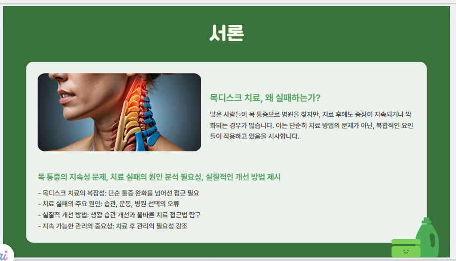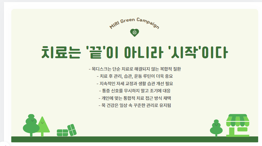 목디스크는 단순한 치료 한 번으로 해결되는 질환이 아닙니다. 오히려 치료 이후의 관리, 습관, 운동 루틴이 훨씬 더 중요합니다. 왜 계속 아픈지 의문이 든다면, 치료 방법이 아니라 ‘내가 어떻게 살고 있었는가’를 되돌아보는 것이 먼저입니다. 목 건강은 병원이 아니라 생활 속에서 유지되는 것임을 기억해야 합니다.