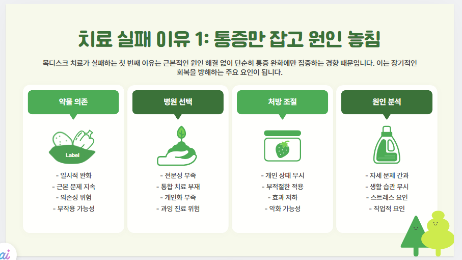 많은 사람들이 목 통증을 느끼고 병원을 찾지만, 생각만큼 쉽게 낫지 않는 경우가 많습니다. 오히려 치료를 받았음에도 불구하고 증상이 반복되거나 더 심해졌다고 느끼는 경우도 적지 않죠. 왜 그럴까요? 치료가 잘못됐던 걸까요, 아니면 우리가 놓치고 있는 무언가가 있었던 걸까요? 이 글에서는 실제로 자주 발생하는 치료 실패의 원인을 분석하고, 반복되는 통증을 막기 위한 실질적인 개선 방법을 제시합니다.